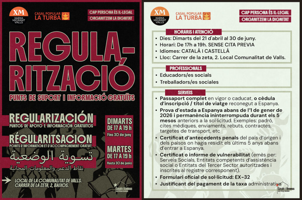 El Casal Popular La Turba, la Xarxa Migrant i La Comunalitat de Valls impulsen un punt gratuït d’informació, assessorament i tramitació de permisos de residència